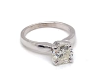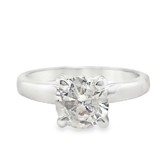 850-57018K white gold diamond solitaire ring. 4.5 grams. One round brilliant cut diamond, 1.25 carat, I3 clarity, JK color. Ring size 6.25.