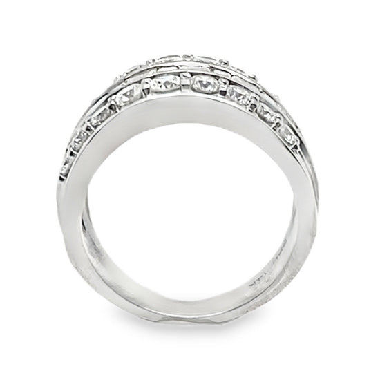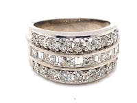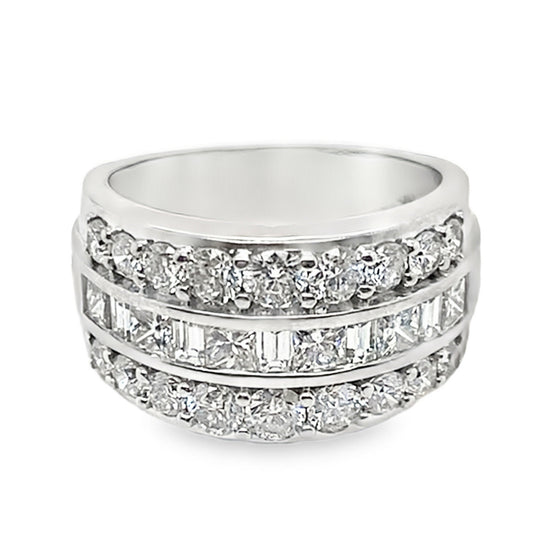 850-61214K white gold diamond band. 8.2 grams. Set are round brilliant, princess & baguette cut diamonds, 1.50 total carat weight, VS-SI clarity, GHI color. 11mm wide, tapered band. Size 6.25.