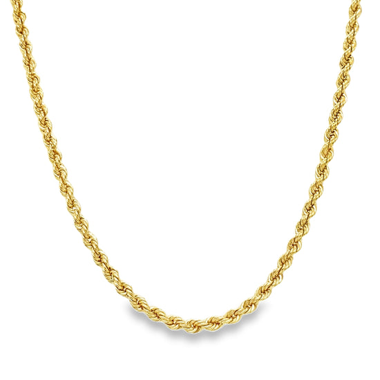 14K yellow gold hollow rope chain. 4.8 grams. 3mm in width & 18 inches in length.