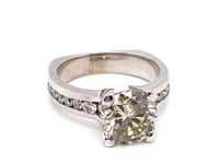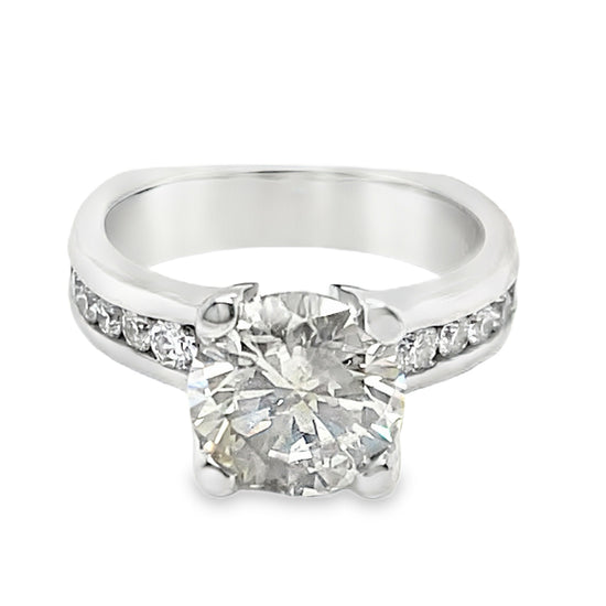 850-61114K white gold diamond engagement ring. 6.4 grams. Set is one round brilliant cut diamond, est. 2.25 carat, SI2 clarity, LM color & 22 round brilliant cut diamonds, .55pts, VS clarity, G color. 2.80 total carat weight. Ring size 6.