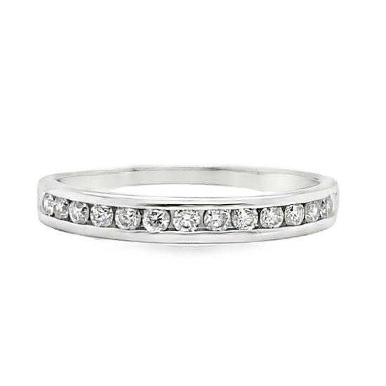 800-1814314K white gold diamond channel set band. 1.7 grams. 13 round brilliant cut diamonds, .20 total carat weight, SI clarity, IJ color. Ring size 7.