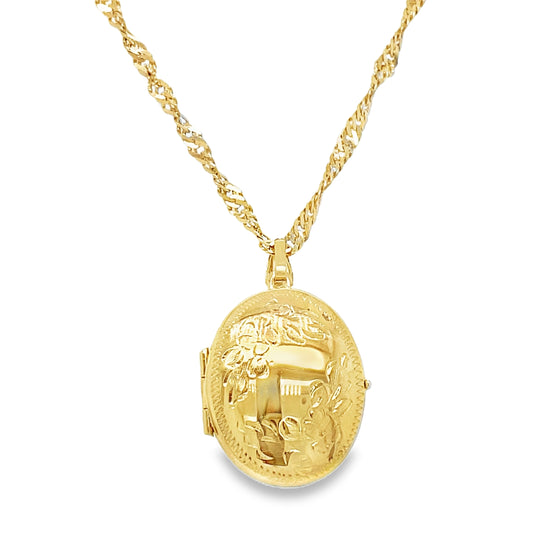 800-1795310K yellow gold carved locket. 6.3 grams. Locket is 1 inch in length & singapore chain is 24 inches in length.