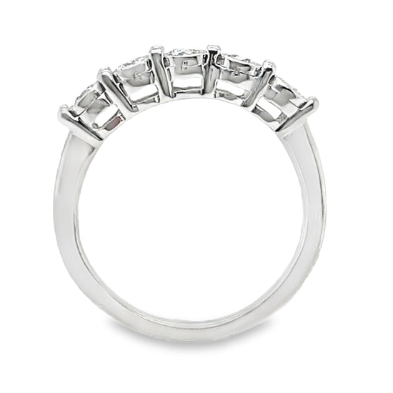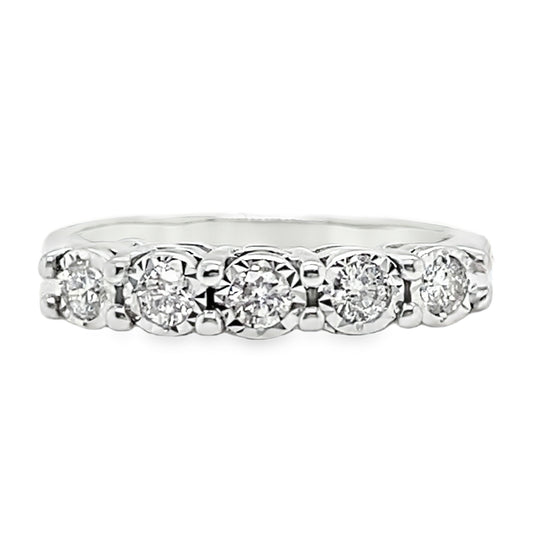 800-1811010K white gold illusion setting diamond band. 2.2 grams. 5 round brilliant cut diamonds, .25 total carat weight, SI2-I1 clarity, GH color. Ring size 4.5.