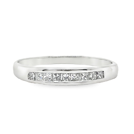 800-1829010K white gold diamond band. 1.5 grams. Channel set are princess cut diamonds, .25 total carat weight, SI-I1 clarity, GHI color. Ring size 7.5.