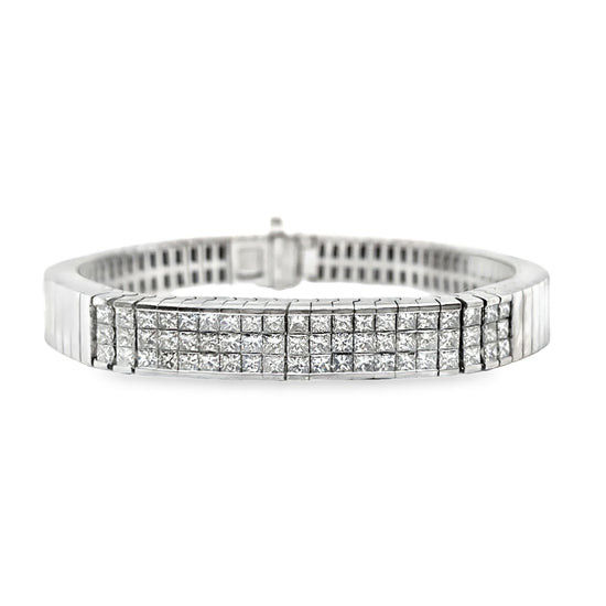 850-57818K white gold invisible set diamond bracelet. 57.0 grams. Set are princess cut diamonds, 3.00 total carat weight, SI2-I1 clarity, FGH color. 7mm wide, approx. 7 inches in length.