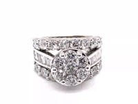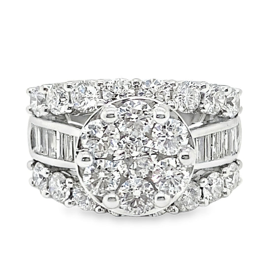 850-54114K white gold wide diamond cluster ring. 13.1 grams. Round brilliant & baguette cut diamonds, 4.00 total carat weight, I clarity, GHI color. Ring size 7.5.