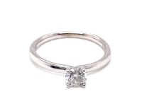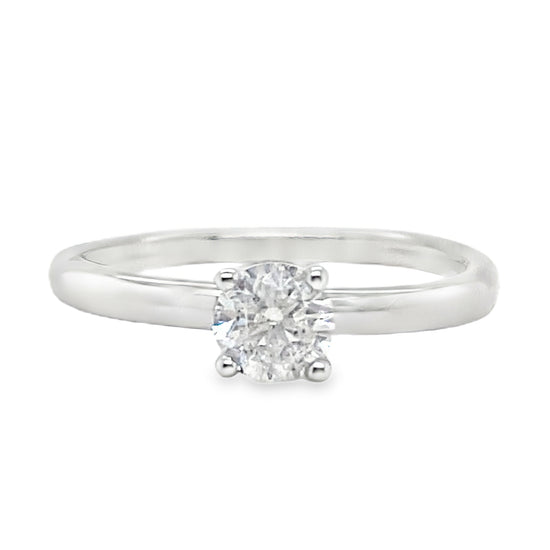 850-57114K white gold diamond solitaire ring. 2.5 grams. One round brilliant cut diamond, .50 carat, I2-I3 clarity, HI color. Ring size 7.25.