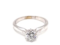 800-1800318K white gold diamond solitaire ring. 3.5 grams. One round brilliant cut diamond, .75 carat, VS1 clarity, G color. Ring size 5.75.