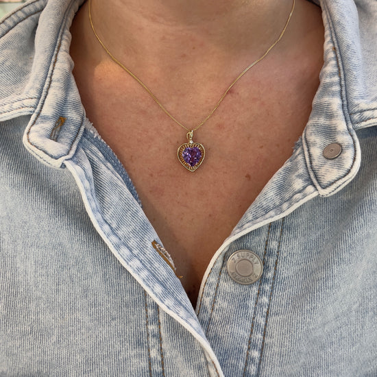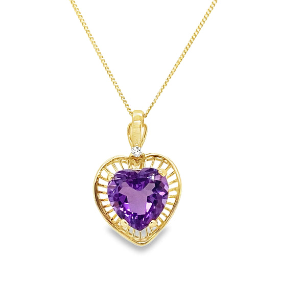 800-1772414K yellow gold amethyst & diamond heart pendant on a 10K yellow gold chain. 4.4 grams. One heart cut amethyst, 10mm & one round brilliant cut diamond, .02pts, SI clarity, GH color. Pendant is 7/8 inch in length & chain is 20 inches in length. Hinged bale.