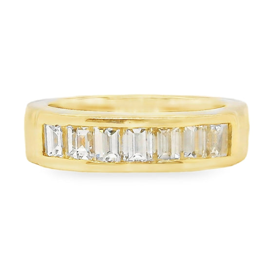 850-47914K yellow gold baguette diamond band with arthritic shank. 7.8 grams. 7 baguette cut diamonds, 1.00 total carat weight, VS clarity, EF color. Ring size 5.25, arthritic hinged shank. Not sizeable.