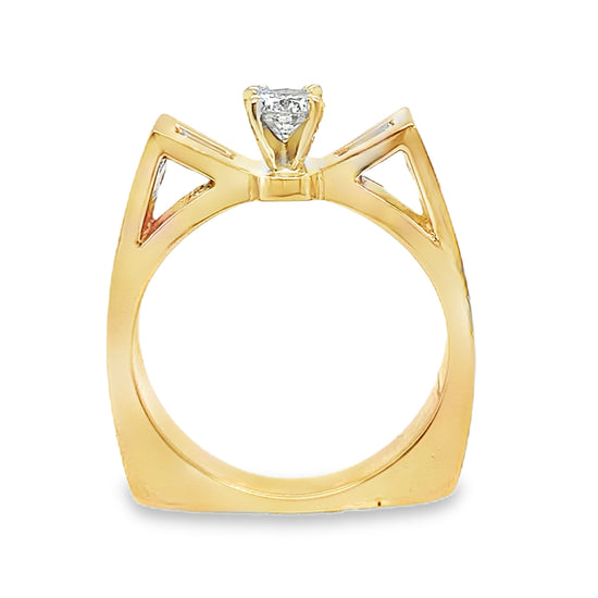 800-1807414K yellow gold diamond ring. 10.3 grams. One round brilliant cut diamond, .38 carat, I clarity, H color & one round brilliant diamond, .23 carat, VS2 clarity, JK color & 2 baguette & one round brilliant cut accent diamonds, .25pts, VS clarity, GH color. .86 total carat weight. Ring size 8.5.