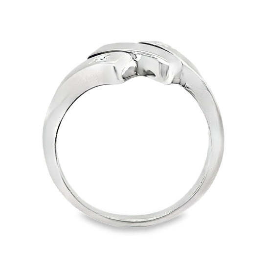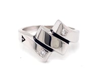 800-1831014K white gold diamond ring with black accents. 7.4 grams. 2 round brilliant cut diamonds, .10 total carat weight, VS clarity, FG color. Ring size 9.5.