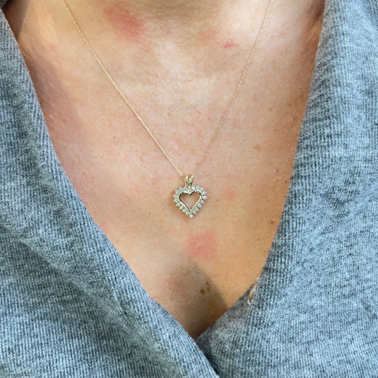 800-1817014K yellow gold diamond heart necklace. 2.6 grams. Set are round brilliant cut diamonds, .50 total carat weight, SI2-I1 clarity, HIJ color. 19 inches in length.
