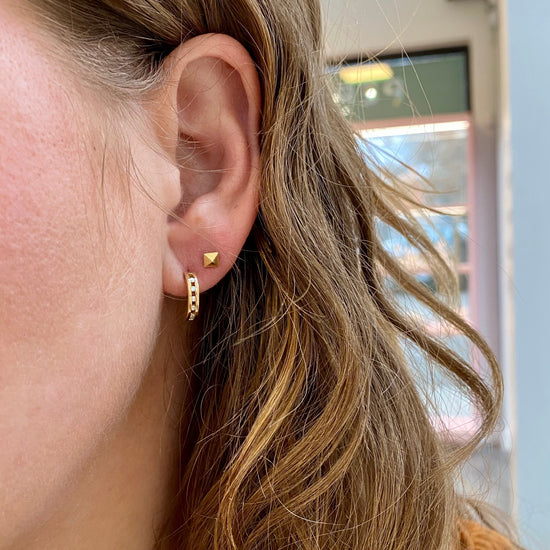 800-1812814K yellow gold diamond crescent earrings. 2.1 grams. Set are ten single cut diamonds, .10 total carat weight, VS clarity, GH color. .5 inch in length.