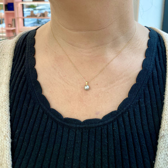 14K yellow gold pearl pendant on a 10K yellow gold cable chain. 1.4 grams. One grey freshwater pearl, 6.5mm. 18 inches in length.
