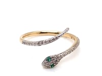 800-1819110K yellow gold snake bypass ring. 1.3 grams. Set are round brilliant cut diamonds, .17 total carat weight, I clarity, HI color & 2 round emeralds. Ring size 7.5.