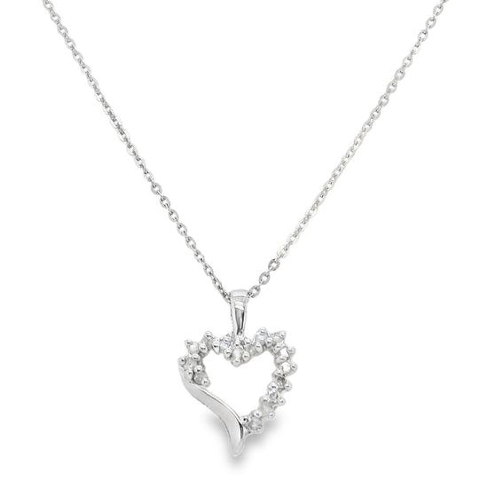 800-1742010K white gold diamond heart pendant on a 14K white gold link chain. 1.9 grams. 15 single cut diamonds, .25 total carat weight, I clarity, HIJ color. 16 inches in length.