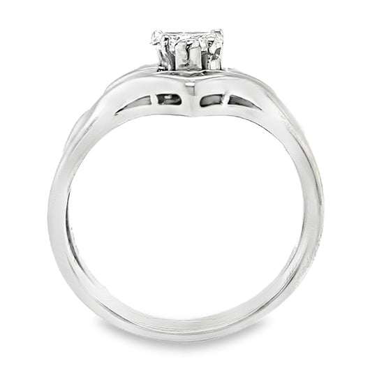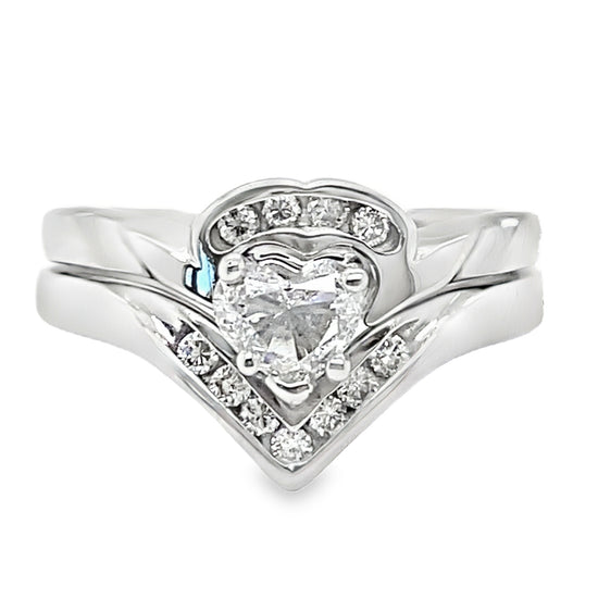 850-52714K white gold heart diamond ring. 5.8 grams. One heart cut diamond, .35 carat, VS2 clarity, GH color & 11 round brilliant cut side diamonds, .15pts, VS-SI clarity, GH color. .50 total carat weight. Ring size 7.25.