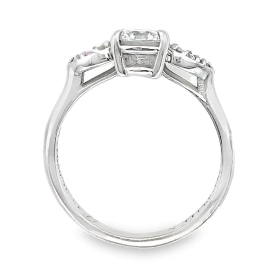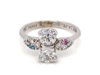 14K white gold custom made diamond ring. 3.5 grams. 2 round brilliant cut Canadian diamonds, 1.01pts, SI1 clarity, F color, laser inscribed, GIA certificates & 6 round brilliant cut side diamonds, .15pts, VS clarity, GH color. Also set is one round cut blue zircon & pink tourmaline. Ring size 6.25.