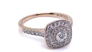 800-1812318/22K rose & white gold diamond ring. 3.9 grams. Set are round brilliant cut diamonds (1x.20 carat), .50 total carat weight, I clarity, EF color. Ring size 5.75.