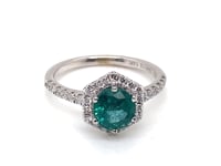 850-61814K white gold emerald & diamond ring by Noam Carver. Style B214. Set is one round cut emerald, est. 1.00carat & round brilliant cut diamonds, .33pts, SI clarity, GH color. Ring size 6.5.