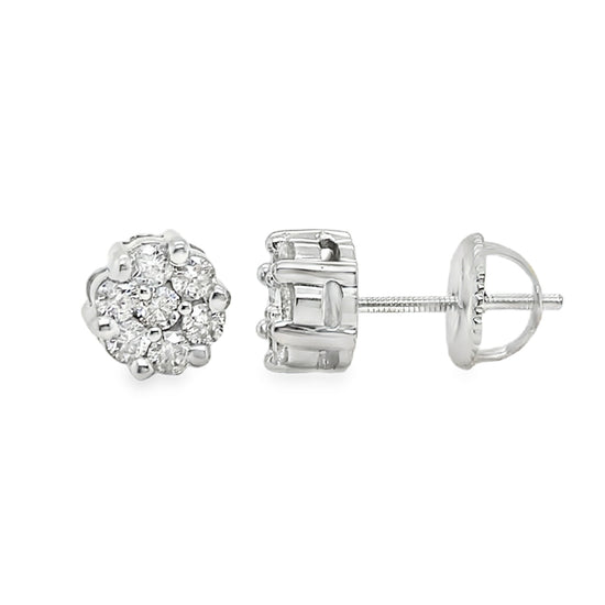 800-1840214K white gold flower shaped diamond cluster studs. 1.8 grams. .50 total carat weight, I clarity, HIJ color.
