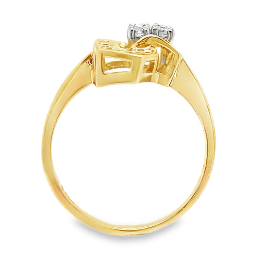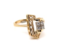 14K yellow gold filigree detail diamond ring. 2.9 grams. 4 round brilliant cut diamonds, .15 total carat weight, VS clarity, GH color. Ring size 6.5.