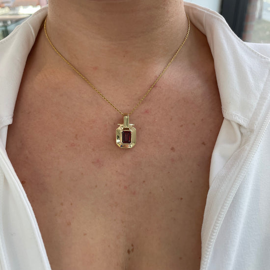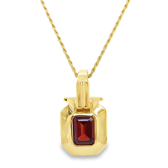 800-1765914K yellow gold garnet pendant on an 18K yellow gold rope chain. 8.2 grams. One rectangular cut garnet, 8x6mm. Pendant is 1 inch in length with a hinged bale. Chain is 16 inches in length