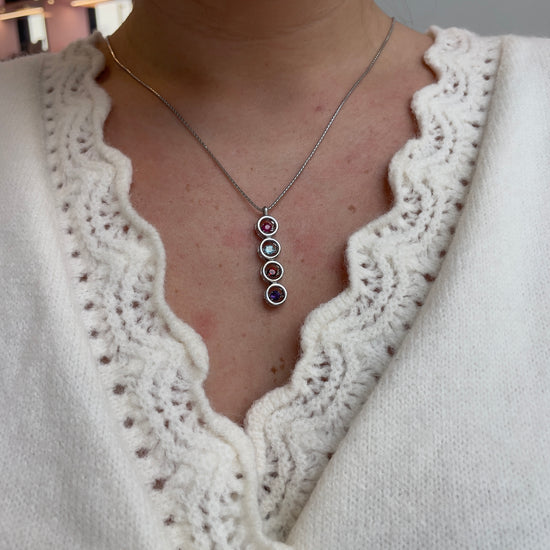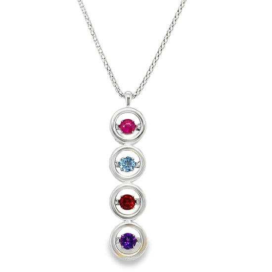 14K white gold gemstone necklace. 6.7 grams. One each round ruby, blue topaz, garnet & amethyst. Pendant is 1.5 inches in length & chain is adjustable up to 22 inches in length.