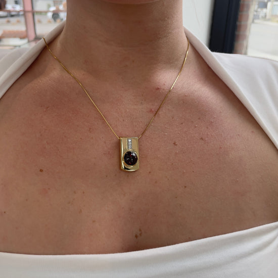 800-1771414K yellow gold garnet & diamond slide pendant on a 10K yellow gold chain. 11.8 grams. One round cabochon cut garnet, 10mmm & 3 round brilliant cut diamonds, .15pts, VS clarity, GH color. Pendant is 1 inch in length & box chain is 22 inches in length.