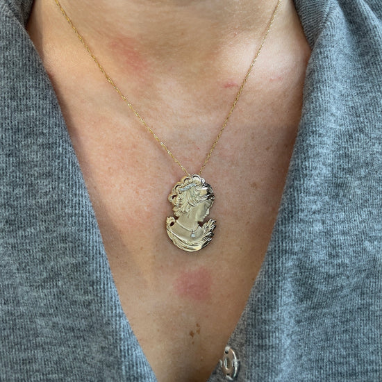 800-1815910K yellow gold cameo necklace. 9.3 grams. 4 single cut diamonds, .03pts, VS clarity, GH color. Pendant is 1.25 inches in length & singapore chain is 18 inches in length.