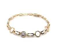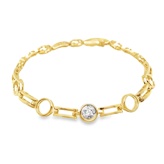 800-1833710K yellow gold diamond bracelet. 9.8 grams. One round brilliant cut diamond, .05 carat, VS clarity, GH color. 7.25 inches in length, safety clasp.