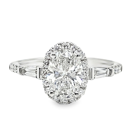 14K white gold lab grown diamond ring. 2.8 grams. One lab grown oval cut diamond, 1.07 carat, VVS2 clarity, E color, laser inscribed "GSI71932790525" & lab grown round brilliant & baguette cut side diamonds, .55pts, VS clarity, EF color. 1.62 total carat weight. Ring size 7.