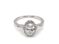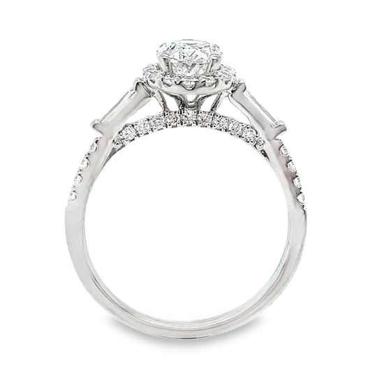 What a stunning & unusual ring design! This one has me a little gaga if I'm being honest. The oval cut lab grown diamond has an understated halo of round diamonds to give it extra oomph & is flanked by two baguette cut diamonds, giving decidedly three stone feels. But the profile, oh my... It is like a bridge covered in more diamonds so it's truly beautiful from every angle.