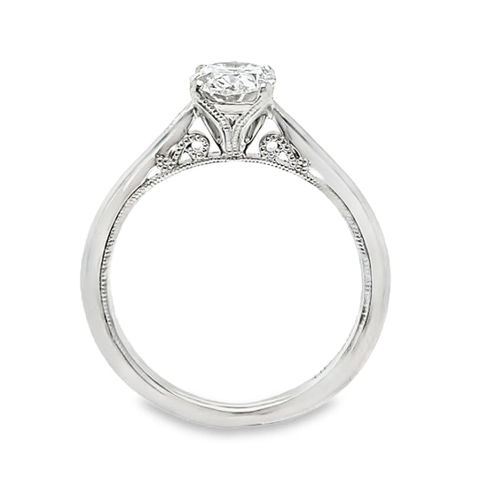 850-55914K white gold Stella engagement ring by Kirk Kara. One lab grown oval cut diamond, 7.21x5.07x3.15mm, .72 carat, VS2 clarity, E color, IGI certificate number LG605376791. Ring size 3.75.
