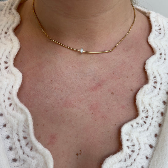 800-1809218K yellow gold diamond bar necklace. 6.6 grams. One marquise cut diamond, .25 carat, SI1 clarity, IJ color. 15.5 inches in length.