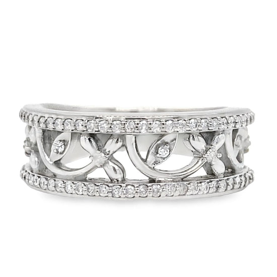 There is something eternally romantic about a wide floral band. It's the perfect juxtaposition of feminine and bold. The white gold has been carefully cut out to have a wonderfully airy feeling. Pair with pretty much everything in your wardrobe. Yes, everything.