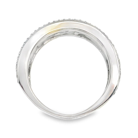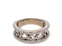 18K white gold wide diamond ring. 7.9 grams. 87 round brilliant cut diamonds, .50 total carat weight, I clarity, HIJ color. 7.5mm in width, slightly tapered. Ring size 6.75.