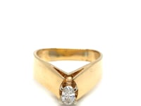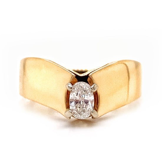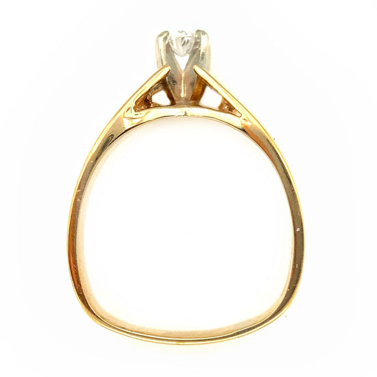 850-18814K yellow gold diamond solitaire ring. 6.6 grams. One oval cut diamond, .25 carat, I1 clarity, J color. Ring size approx. 9, square shank.