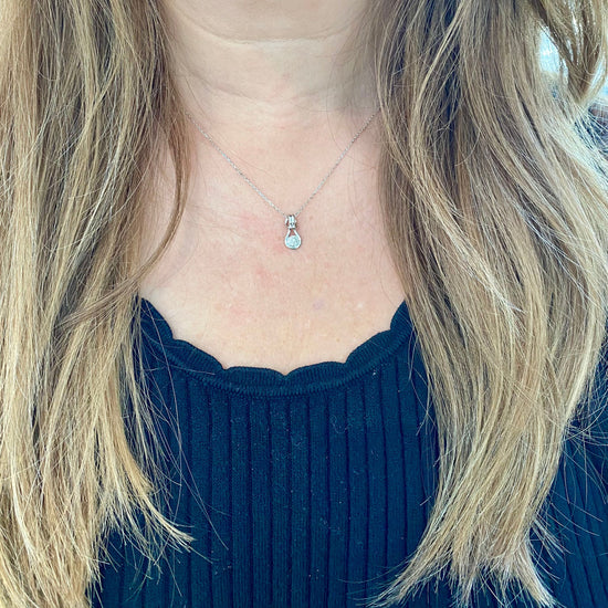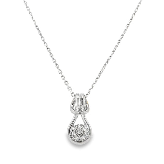 14K white gold diamond pendant on a 10K white gold cable chain. 2.2 grams. 8 round brilliant cut diamonds, .05 total carat weight, SI clarity, FG color. 18 inches in length.