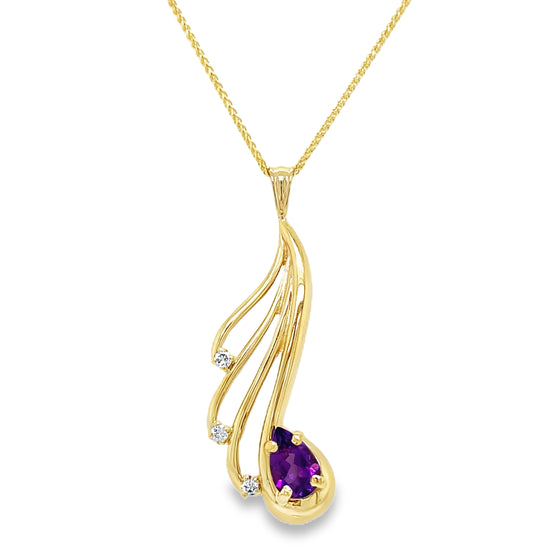 800-1781414K yellow gold amethyst pendant on a 10K yellow gold wheat chain. 7.3 grams. One pear cut amethyst, 9x6mm & 3 round brilliant cut diamonds, .10 total carat weight, SI-I1 clarity, GH color. Pendant is 1.75 inches in length & chain is 18 inches in length.
