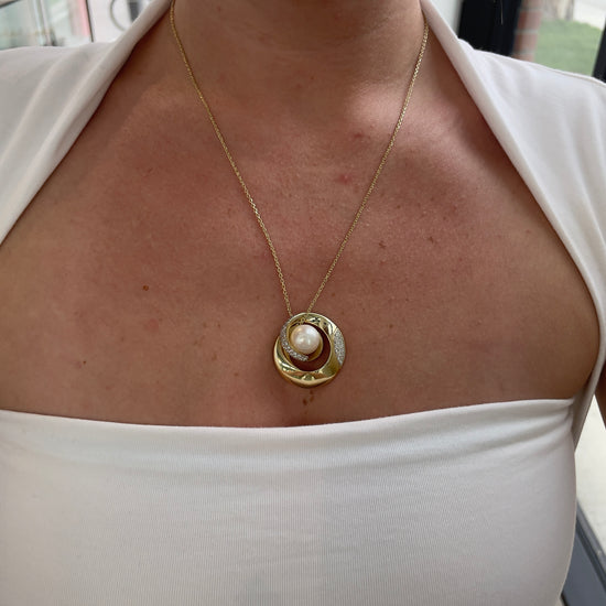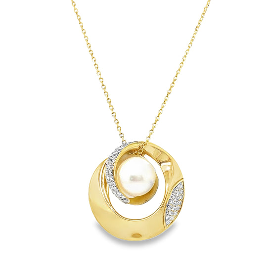 800-1771514K yellow gold pearl & diamond slide necklace. 13.1 grams. One freshwater pearl, 11mm & round brilliant cut diamonds, .50 total carat weight, VS clarity, GH color. Pendant is 1 inch in length & cable chain is 20 inches in length.