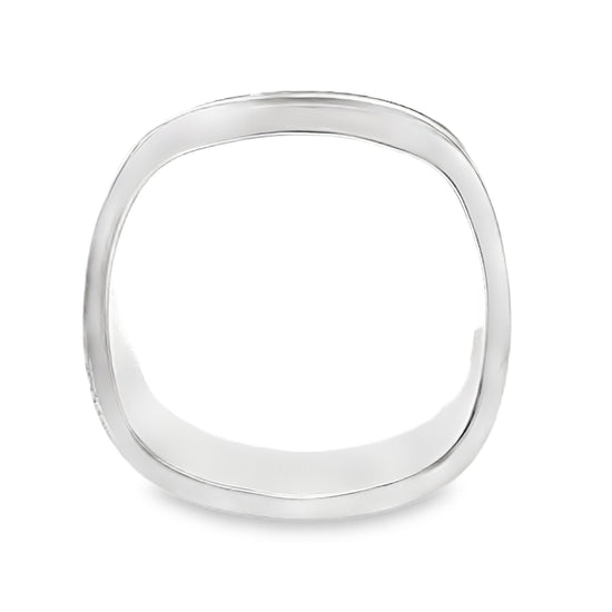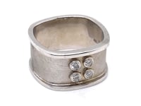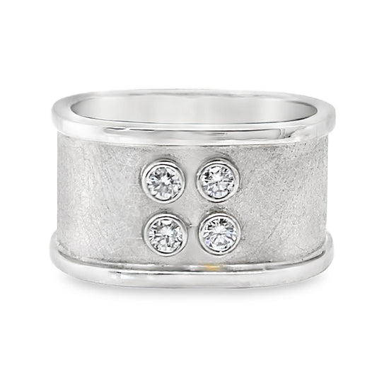 800-1754918K white gold wide diamond band. 10.7 grams. 4 round brilliant cut diamonds, .20 total carat weight, VS clarity, EF color. 11mm in width. Wire brush & polished finish. Ring size approx. 7.5, square shank.