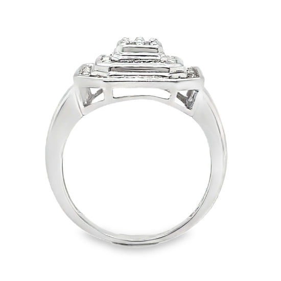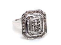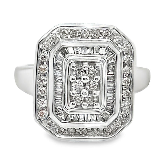 800-1830014K white gold diamond ring. 4.4 grams. Set are round brilliant and baguette cut diamonds, .50 total carat weight, VS-SI clarity, HIJK color. Ring size 7.