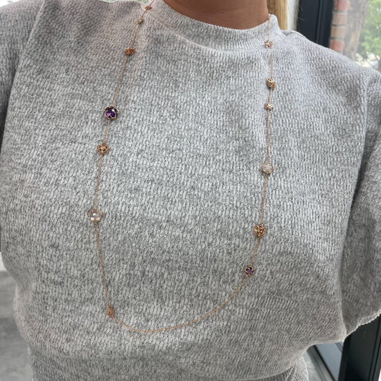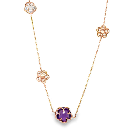 800-1795714K rose gold rose quartz & amethyst flower station necklace. 10.5 grams. 36 inches in length.