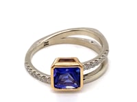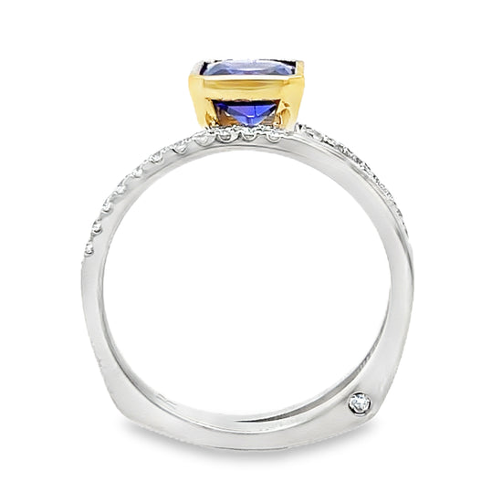 800-1807318K white & yellow gold tanzanite & diamond ring. 3.9 grams. One square cut tanzanite, est. 1.23 carats & round brilliant cut side diamonds, .19pts, VS clarity, GH color. Ring size 7.
