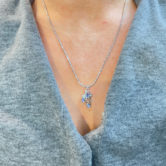 800-1820118K white gold tanzanite pendant on a 14K white gold snake chain. 11.9 grams. Set are oval cut tanzanites, est. .75 total carat weight & round brilliant cut diamonds, .03pts, SI clarity, GH color. Pendant is 1 inch in length & chain is adjustable up to 20 inches.