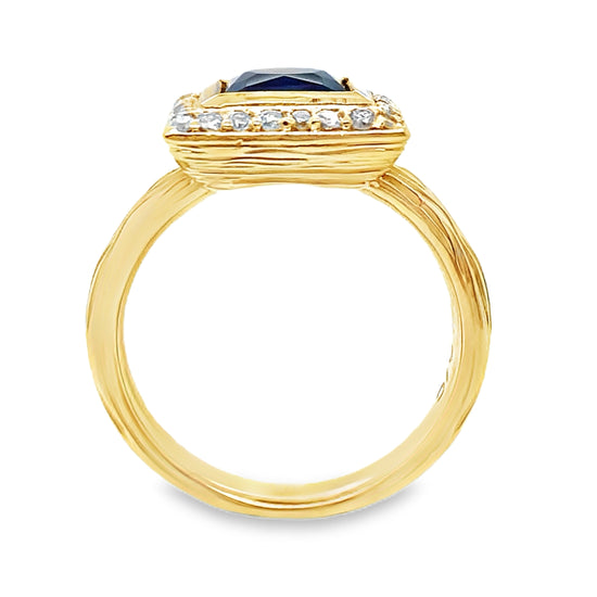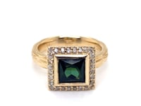 850-59614K yellow gold tourmaline & diamond ring. 7.9 grams. One square cut green tourmaline, 7mm, est. 2.11 carat & round brilliant cut halo diamonds, .40pts, SI clarity, GH color. Ring size 7.25.