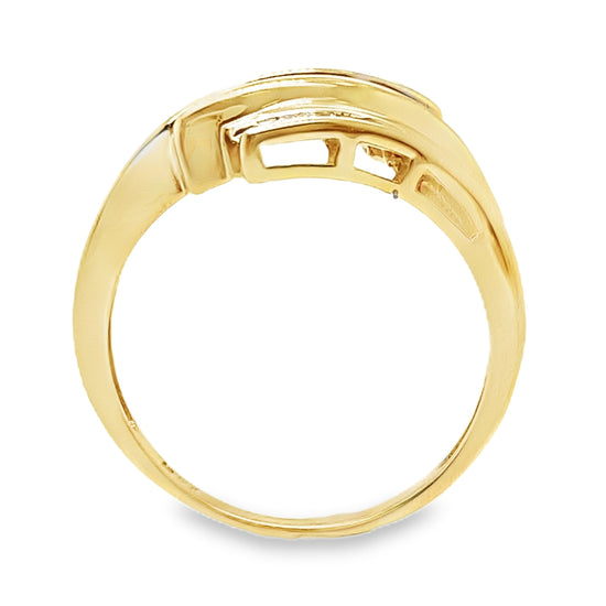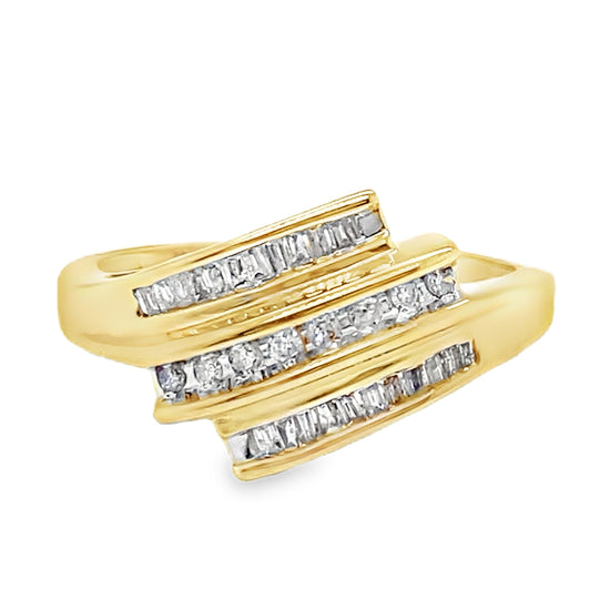 800-1762410K yellow gold diamond bypass ring. 2.8 grams. Round brilliant & baguette cut diamonds, .50 total carat weight, SI-I clarity, HIJ color. Ring size 8.