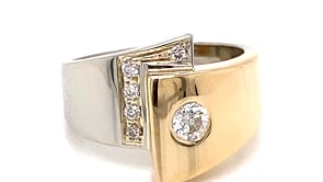From award winning designer Lilian Jensen comes this bold right hand ring. If you know Lilian's creations, they are all strong, sexy and wearable every single day. In this piece, the feature diamond is set ultra low, absolutely no prongs to catch. Half white gold + half yellow gold = goes with everything you own. From Lil's heart to yours.